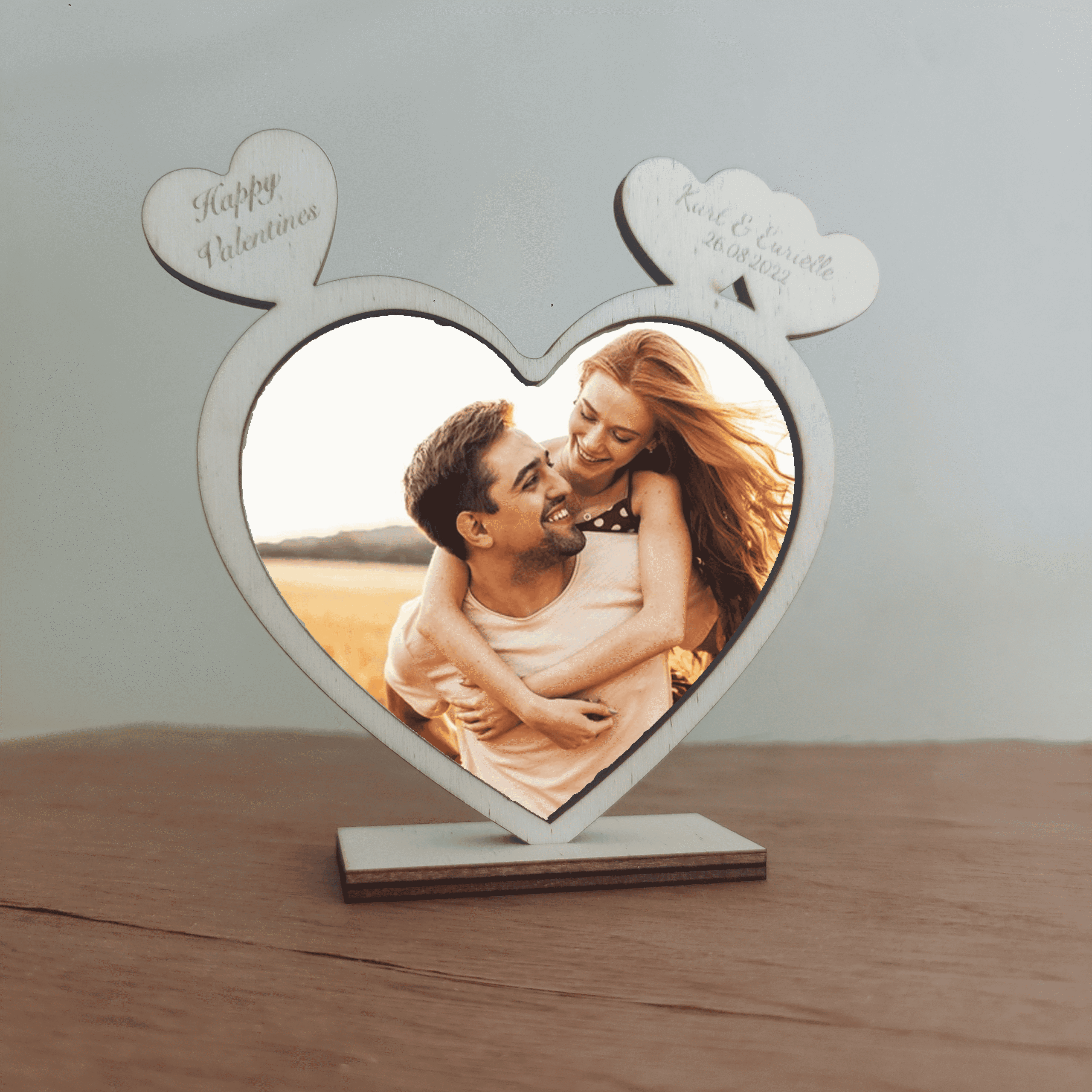 Embrace your cherished memories with our beautifully crafted custom wooden heart photo frame, featuring laser cut designs and double hearts on top for engraving. This unique piece includes a high-quality photo print on 80gsm recycled paper, making it a perfect gift or a timeless addition to your home decor.
